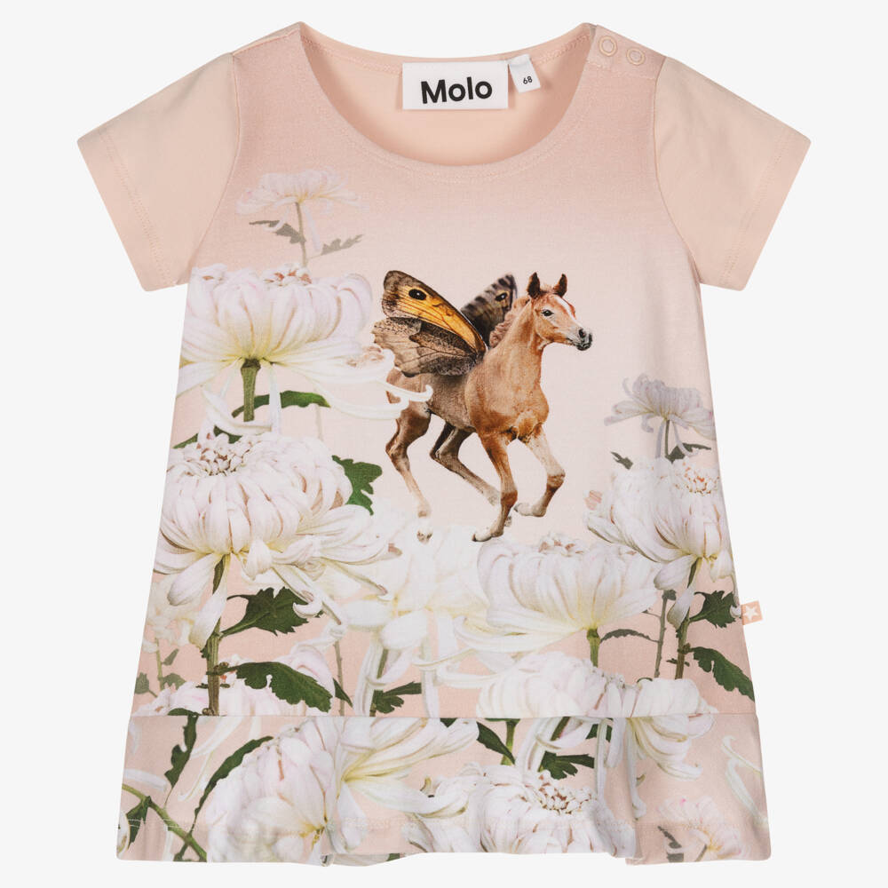 Sweet pale pink dress for younger girls by Danish brand Molo, made in soft and stretchy organic cotton jersey. The front is printed with lovely white flowers and a unique brown hose with butterfly wings as a centrepiece. It is trimmed with a matching flower print ruffle around the hem and there are easy-to-fasten poppers on one shoulder.
