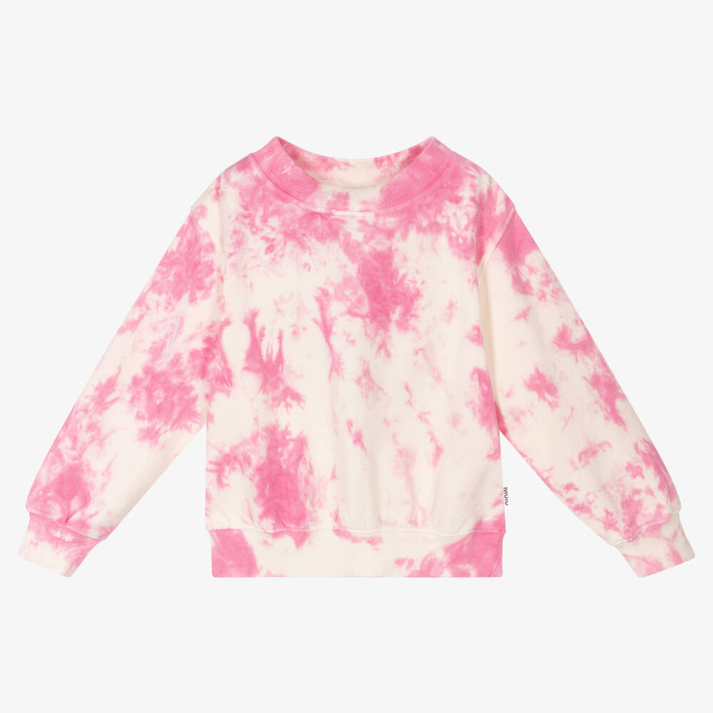 Pink and ivory tie-dye sweatshirt for girls by Danish brand Molo, made in soft organic cotton jersey. With a soft fleecy inside, this casual piece has a classic crew neck and ribbed trims to keep warmth locked in. There is a small logo tab on one side for a branded touch.