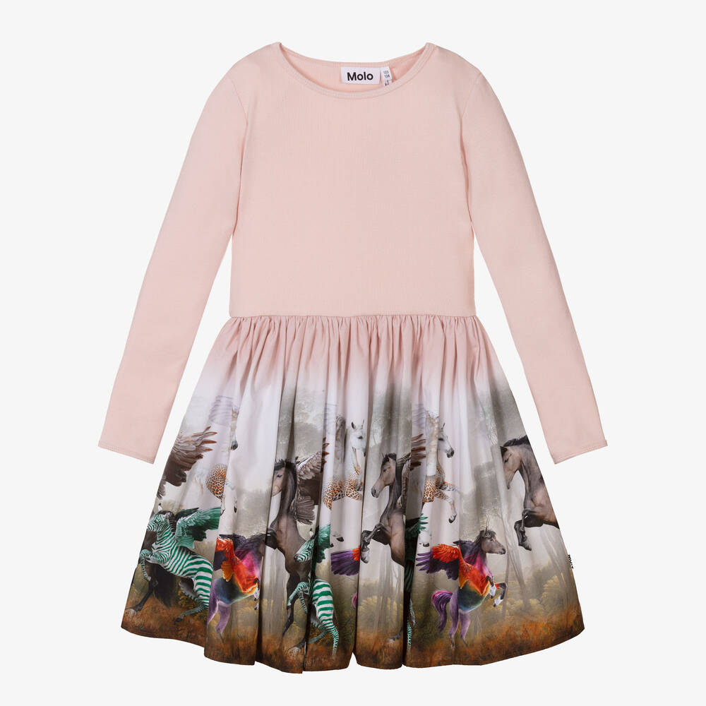 Casual pale pink skater dress for girls by Danish brand Molo, made in soft organic cotton. The fitted bodice is made in comfortable and stretchy ribbed jersey with long sleeves. Gathered around the waist, the full-circle poplin skirt has a colourful unicorn and pegasus print.
