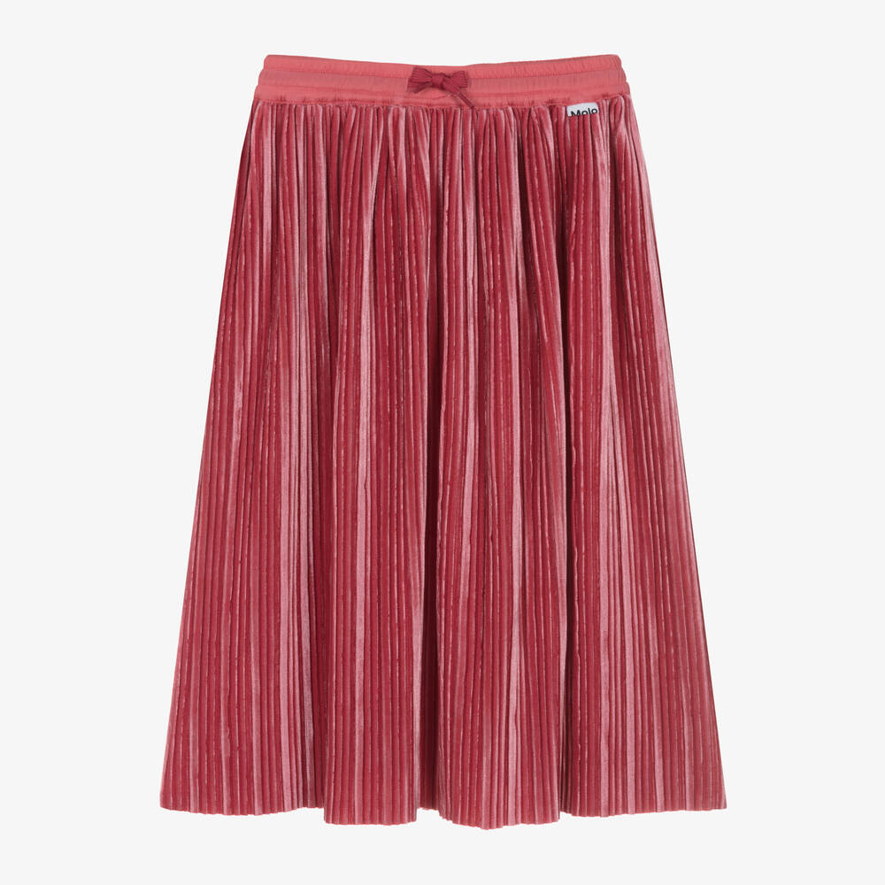 Stylish flamingo pink pleated skirt for girls by Danish brand Molo, made in super soft velour with a lovely crushed velvet look. A simple, pull-on style, it has an elasticated drawstring waistband for a good fit. This easy-to-wear plissé skirt is comfortable and stretchy with a beautiful drape.