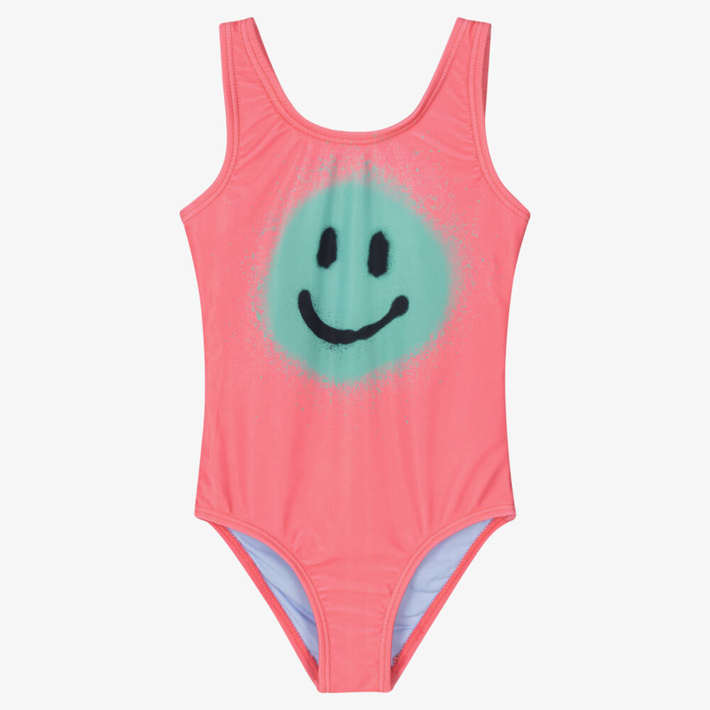 Pink swimsuit for girls by Molo, with UPF 50+. Classically styled, it has an eye-catching green smiling face print. Silky smooth and stretchy, it is fully lined for added comfort and modesty.