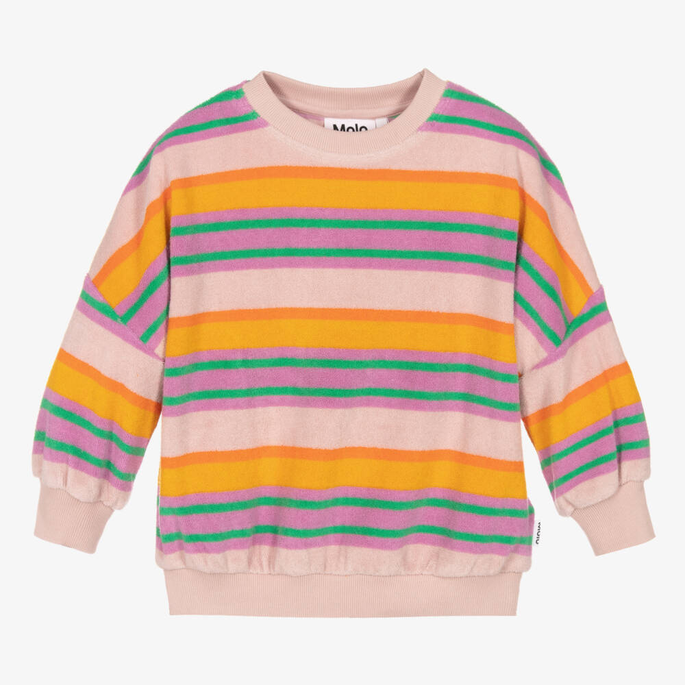 A pink cotton sweatshirt for girls by Molo, made in soft terry towelling for a nostalgic, 70's-inspired look. Fun to wear and style, this sweatshirt is patterned in colourful stripes, with comfortable ribbed trims.