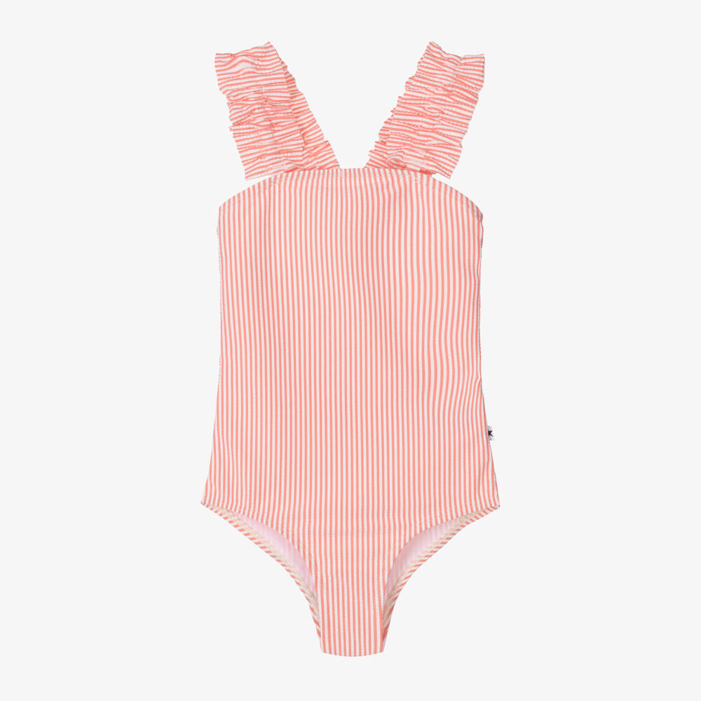 A coral pink and white stripe swimsuit for girls from Molo, with UPF50+. Made in soft, stretchy fabric with a seersucker design, it has ruched ruffle shoulder straps that cross over on the open back. Fully lined for comfort, this lovely one-piece has a feminine square neckline and a star logo tab on the side.