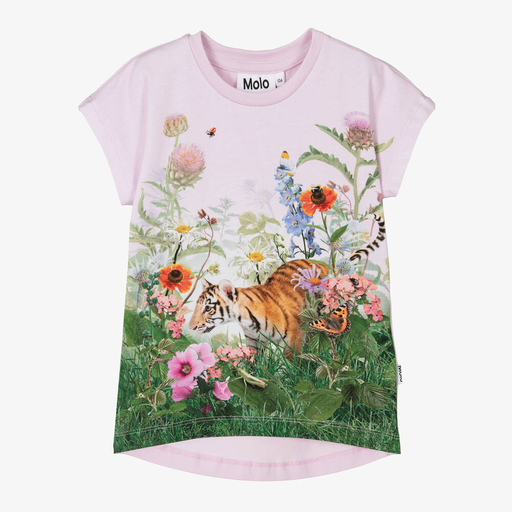 A pink T-shirt for girls by Molo, made from soft organic cotton jersey. It has a beautiful tiger and floral garden design on the front for an eye-catching look. This relaxed top is styled with dropped shoulders, capped short sleeves and a shaped hemline on the back.