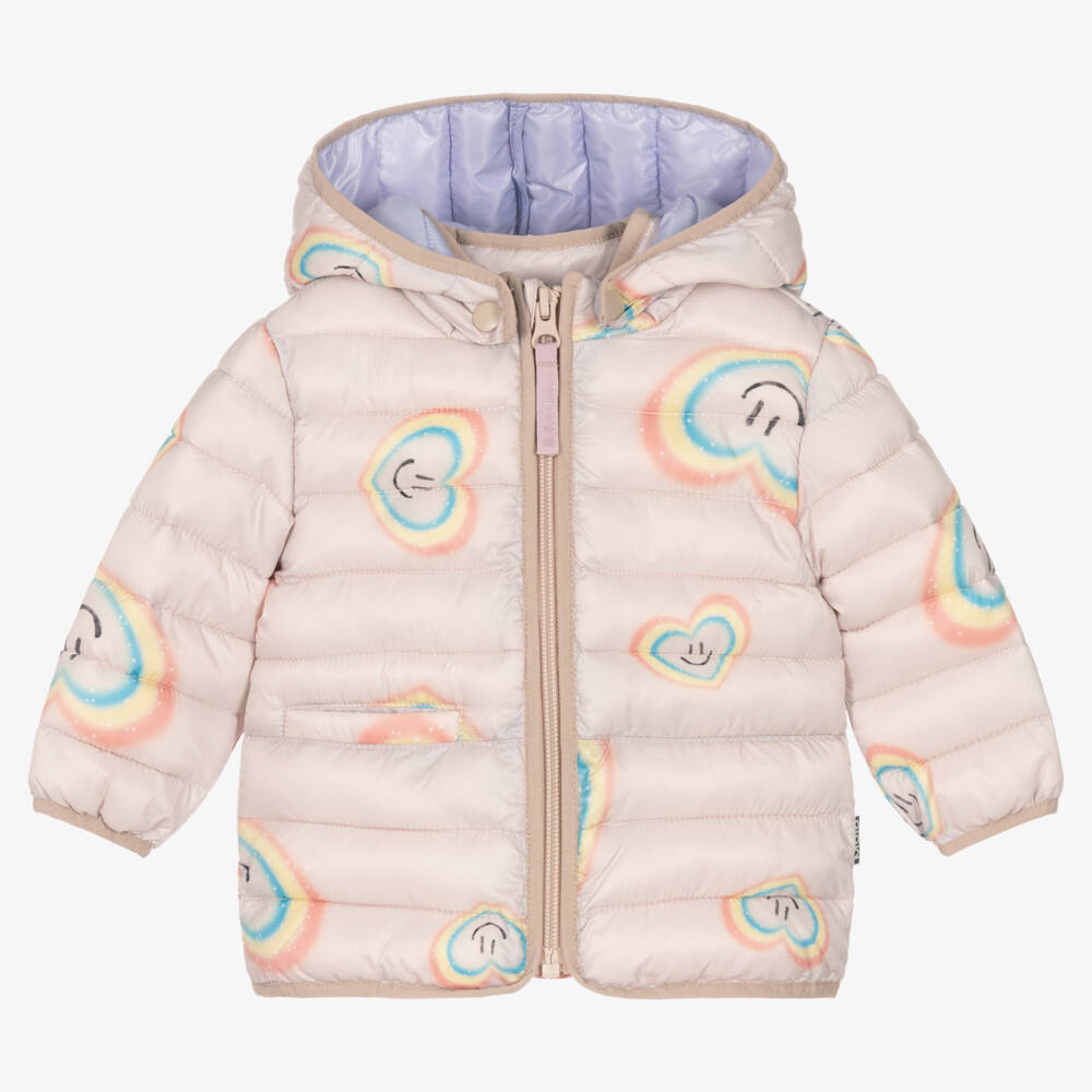 Pale pink water-repellent puffer jacket for little girls by Danish brand Molo. Soft, smooth and durable, it has a detachable hood, a useful front pocket and navy blue, elasticated trims. The front zip fastening has a protective chin guard and a logo pull tab. With a full, silky lining, it is lightly padded with recycled materials and is both breathable and weatherproof.
