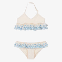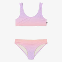 Beautiful purple and white bikini for girls by Molo, patterned with a summery floral print in vibrant shades of purple, red and yellow. Made in a silky smooth fabric with UPF50+, it is comfortably styled with elasticated trims, striped with glittery gold and asymmetric cross-over shoulder straps. This pretty style is fully lined for comfort and modesty.
