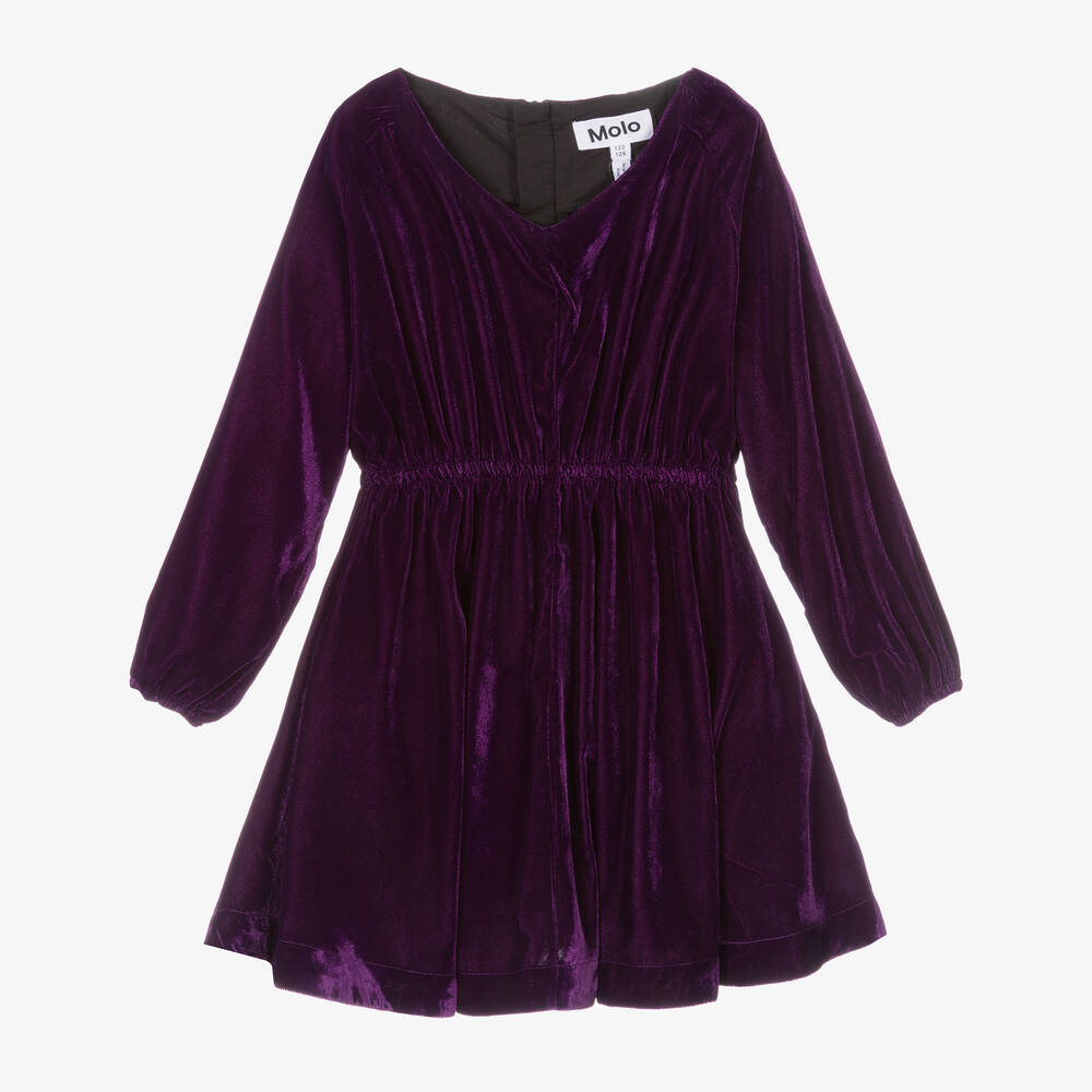 A lovely velvet dress for girls by Danish brand Molo, beautifully soft in a rich purple tone. Stylish for a special occasion, this skater dress is simply styled with a V-neck, flattering puffed long sleeves and a gently elasticated waist. It has a silky lining for comfort and fastens neatly with a concealed zip on the back.