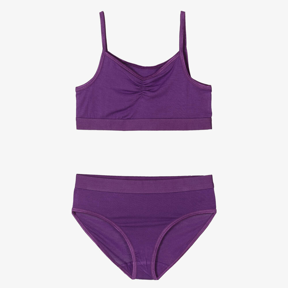 A purple bra top and knickers set for girls from Danish brand Molo, made in beautifully soft viscose jersey for comfortable wear. The top has narrow shoulder straps, a ruched detail on the front and a wide elasticated hem. The matching knickers have an elasticated waist for unrestricted movement. This lightweight underwear set contains sustainable Lenzing EcoVero fibres.