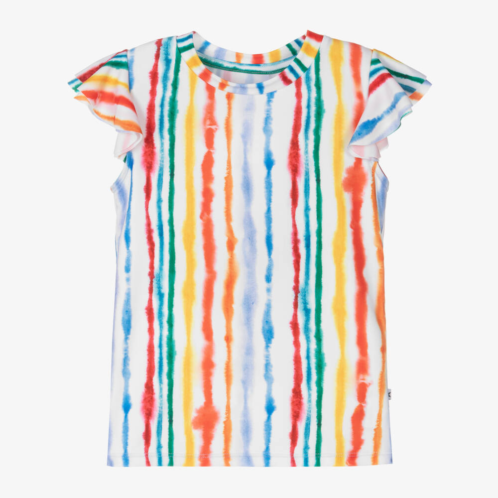 White, UPF50+ swim top for girls by Molo, with a watercolour rainbow stripe print. For an added sweet touch, it has layered, flutter short sleeves. Ideal for use in the pool or at the beach, this lightweight top is made in silky, stretchy recycled fabric. For a discreet designer finish, the brand's Star logo tab can be seen on the side seam.