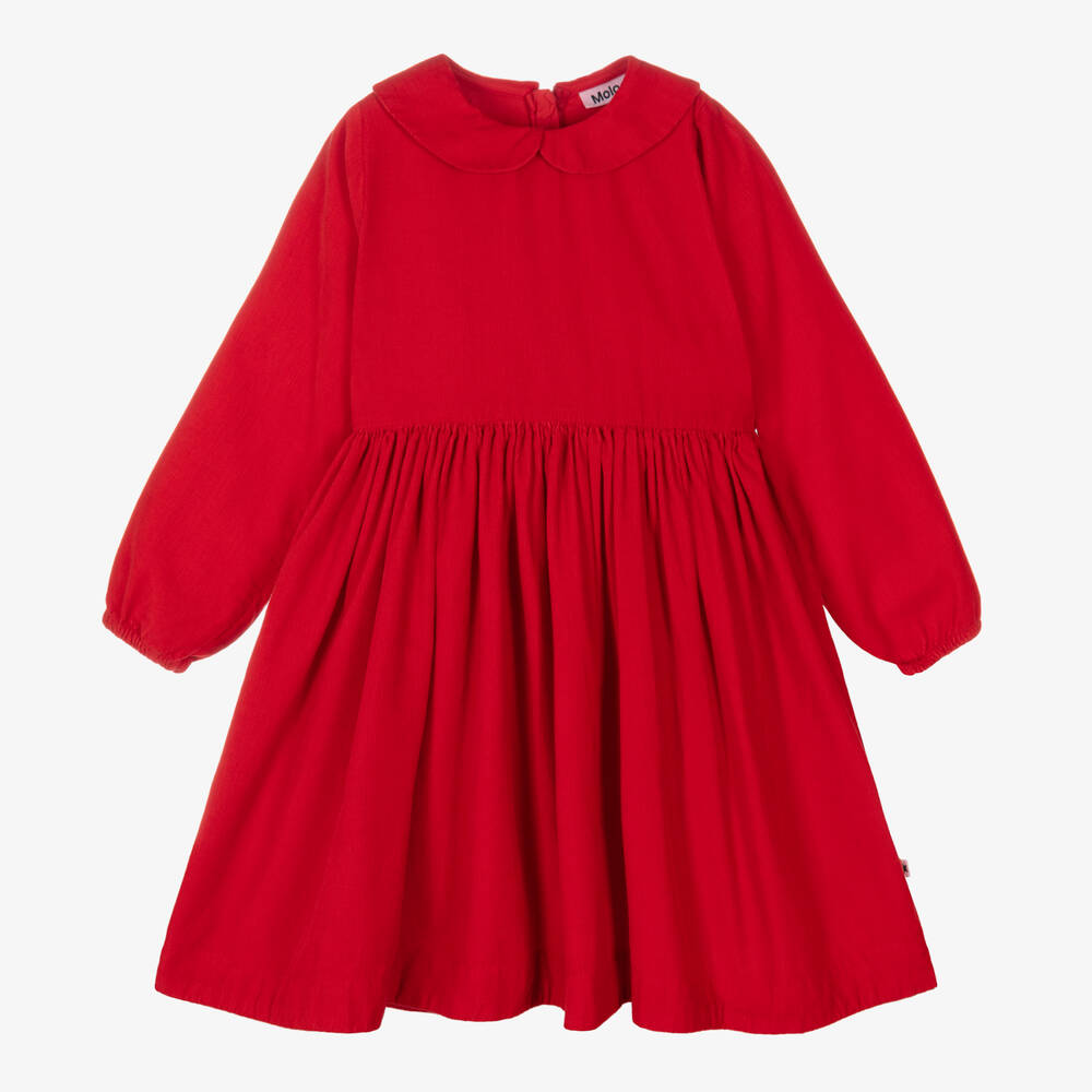 A charming red dress for little girls by Molo, made from soft organic cotton needlecord. In a lovely fit and flare style, it has long sleeves with elasticated cuffs and a sweet collar for a classic look. It fastens with a concealed zip on the back for a neat finish.