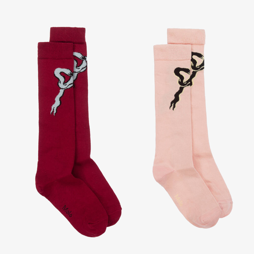 Pack of two, burgundy red and pale pink knee-length socks for girls by Molo. Made from a soft cotton-blend knit, both pairs have pretty jacquard ribbon bow designs for a sweet style. There are logo details on the soles for a subtle branded finish.