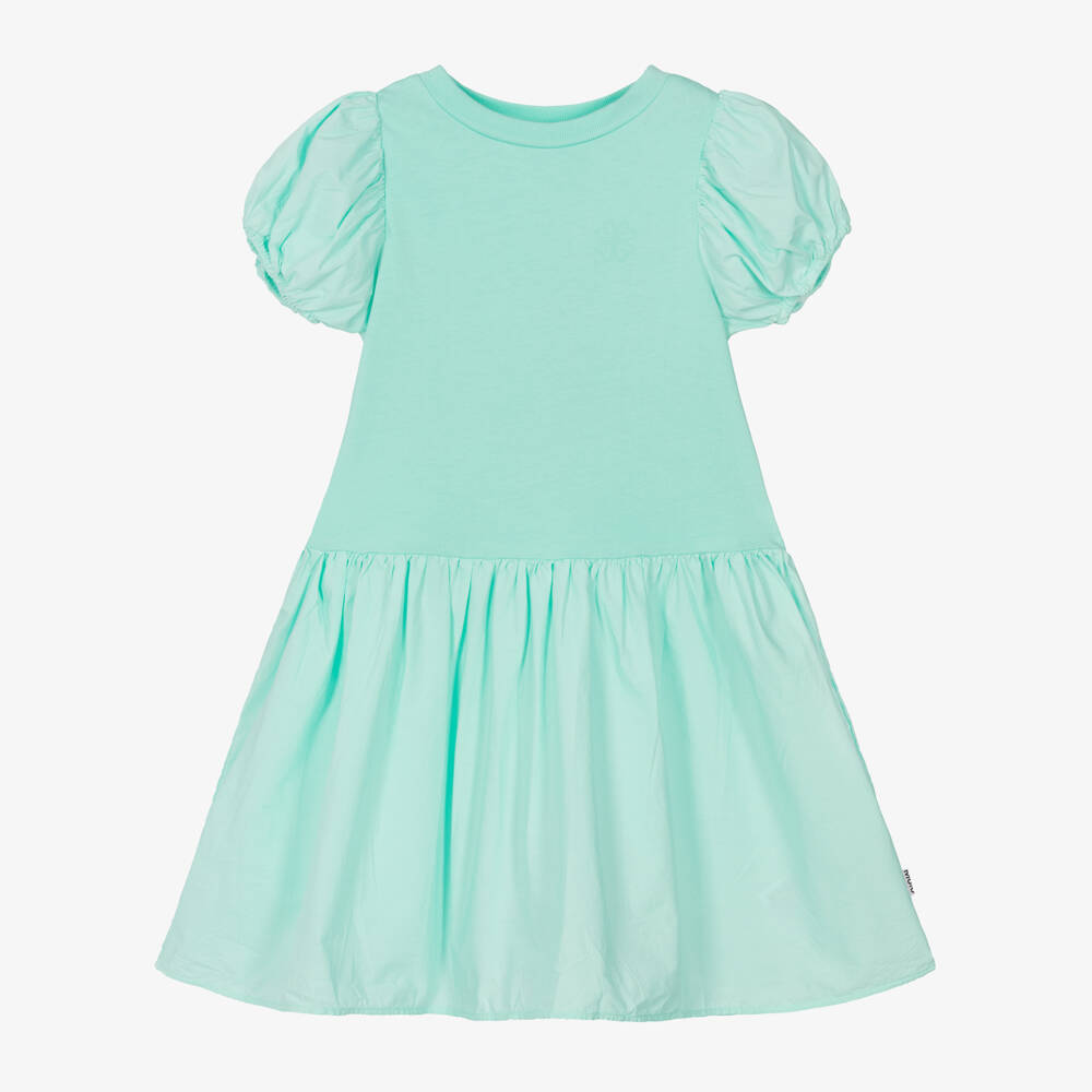A lovely pale turquoise green dress for girls by Molo, made from soft organic cotton. For comfortable wear, the bodice is made from stretchy jersey and has a tonal four-leaf clover design printed on the chest for a sweet finish. The gathered skirt and elasticated puffed short sleeves are made from lightweight poplin for a subtle contrast in texture.
