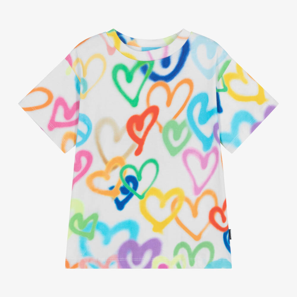 Patterned in multicolour hearts with a spray paint effect, this white short-sleeved T-shirt for girls is by Danish brand Molo. Casual and comfortable, it is made in organic cotton jersey, with a crew neckline. A logo tab on the side seam adds a subtle designer finish.