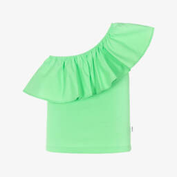 This white asymmetric top for girls by Molo, offers both comfort and standout style. Made in soft organic cotton ribbed jersey, it features a poplin ruffle over one shoulder and a gently elasticated neckline for easy wear.