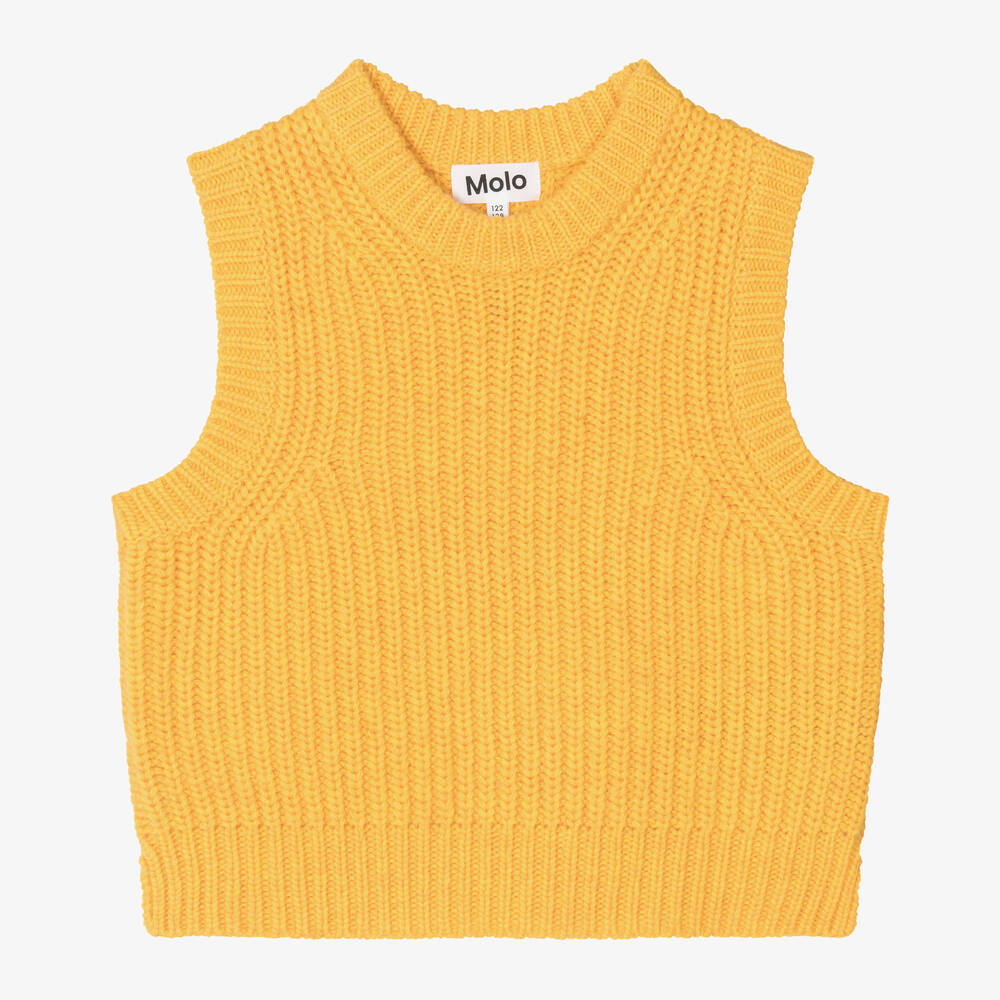 Deep golden yellow slipover for girls by Molo, made in a super-chunky knit. Cosy and comfortable, this wool-mix sweater vest is a great way to add a vibrant layer to her outfit.