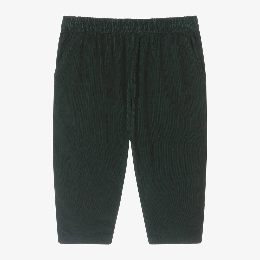 Casual dark green organic cotton trousers for little boys and girls by Danish brand Molo. They are made in needlecord and gently elasticated around the waist for comfort and easy pull-on. They have useful side pockets and two back pockets, one trimmed with small logo tab for a subtle designer finish.