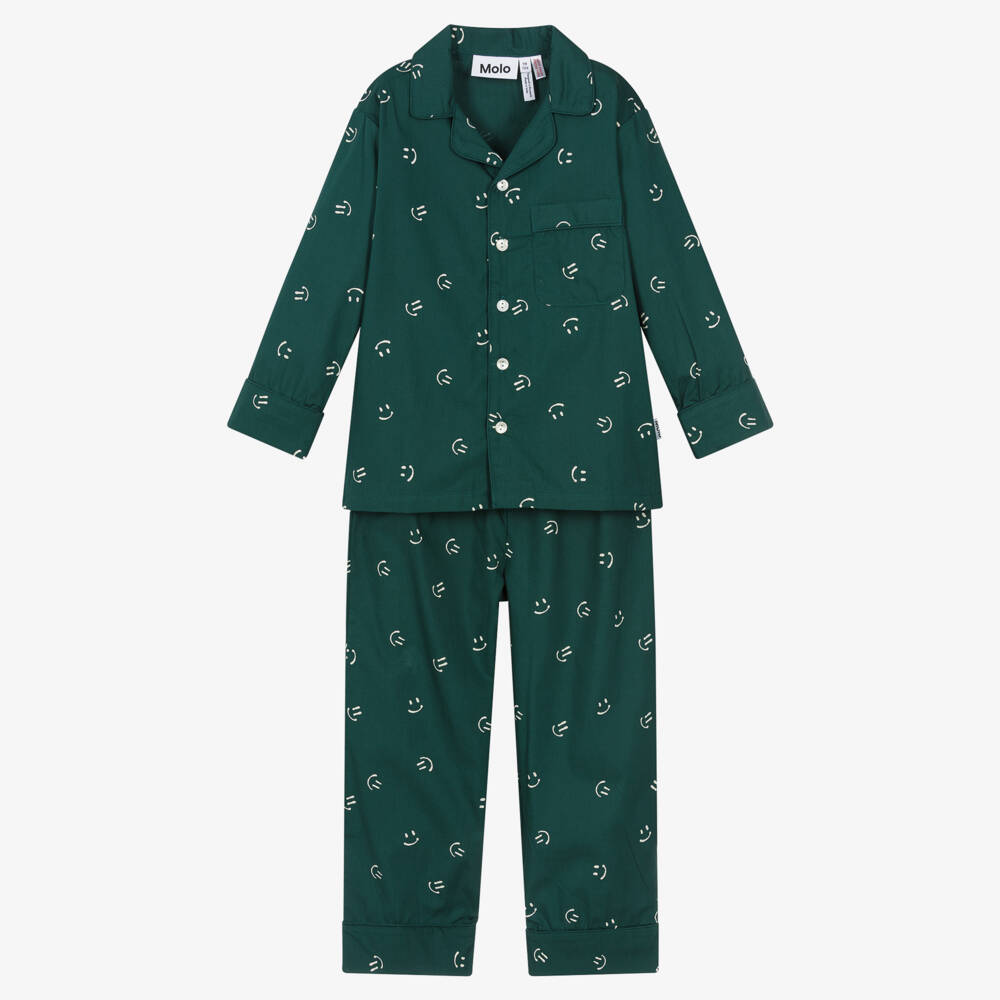 Dusky pink pyjamas for boys and girls from Danish brand Molo, made in soft and comfortable organic cotton poplin. They are patterned in a cute white happy face print with piping trims for a classic look. The top has a revere collar, a chest pocket, pearly button fastenings and a logo tab on the side. The trousers have an elasticated waist with an adjustable drawstring tie. They come with a lovely ivory branded pouch.