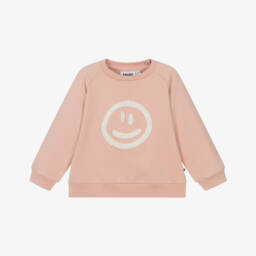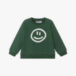 Green sweatshirt for little boys and girls by Molo, made in soft organic cotton jersey with a warm, fleecy inside. Casual and cosy, it features a white bouclé smiling face on the front, adding a fun touch to any outfit. It has a ribbed hem and cuffs and raglan sleeves with popper fastenings on the back of one shoulder.