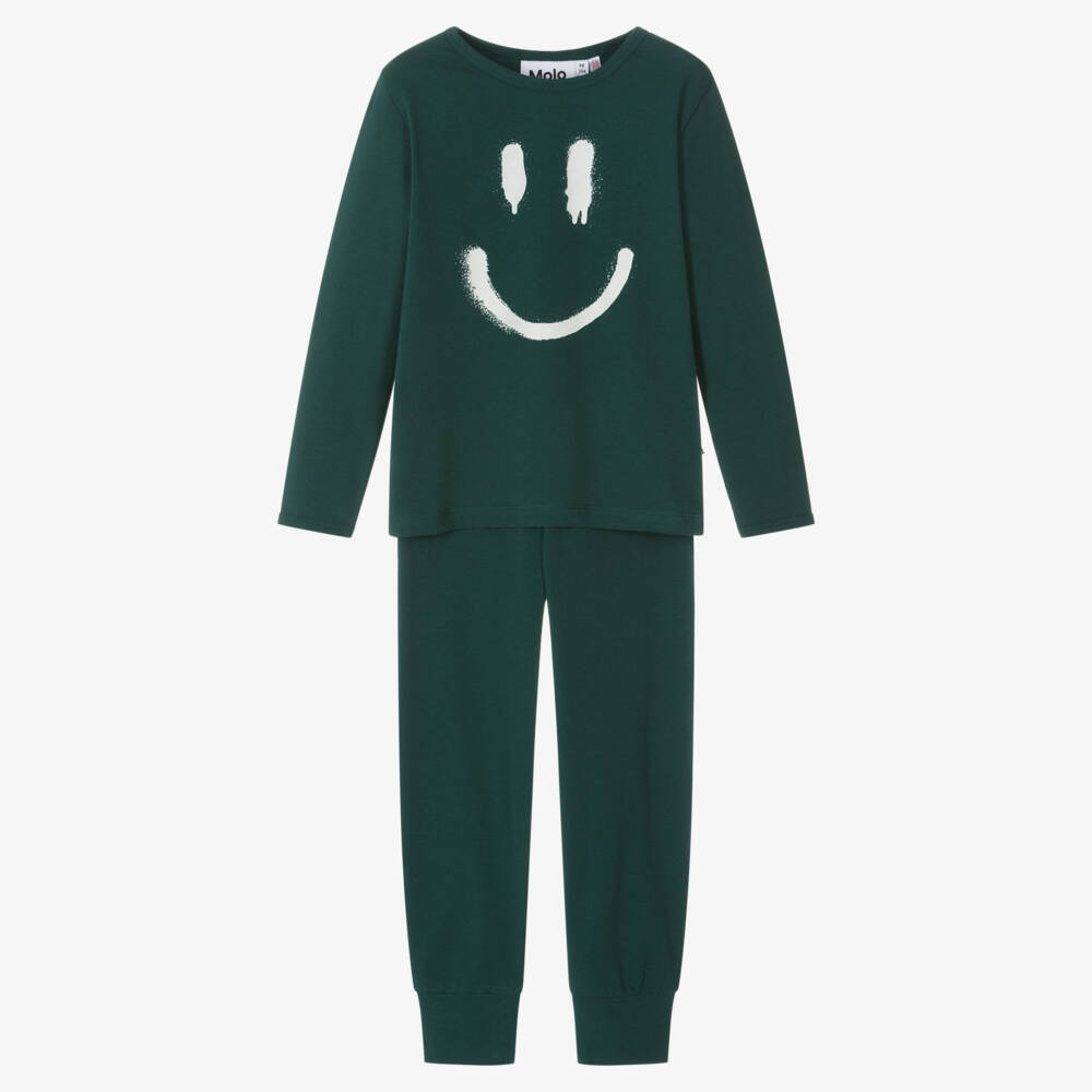 Dark green pyjamas for boys and girls by Danish brand Molo, made from super soft organic cotton jersey. The long sleeved top has a white graffiti-style smiling face print on the front and a logo tab on the side seam. The trousers are cuffed at the ankle and have a comfortable elasticated waist.