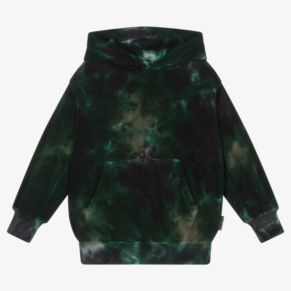 A dark green hoodie for boys and girls by Molo, made in soft organic cotton jersey. Fleecy on the inside, this mid-weight top is designed in a unique tie-dye print with a handy pouch pocket on the front. Designed for a relaxed fit, it has comfortable ribbed trims and a logo tab on the side seam.