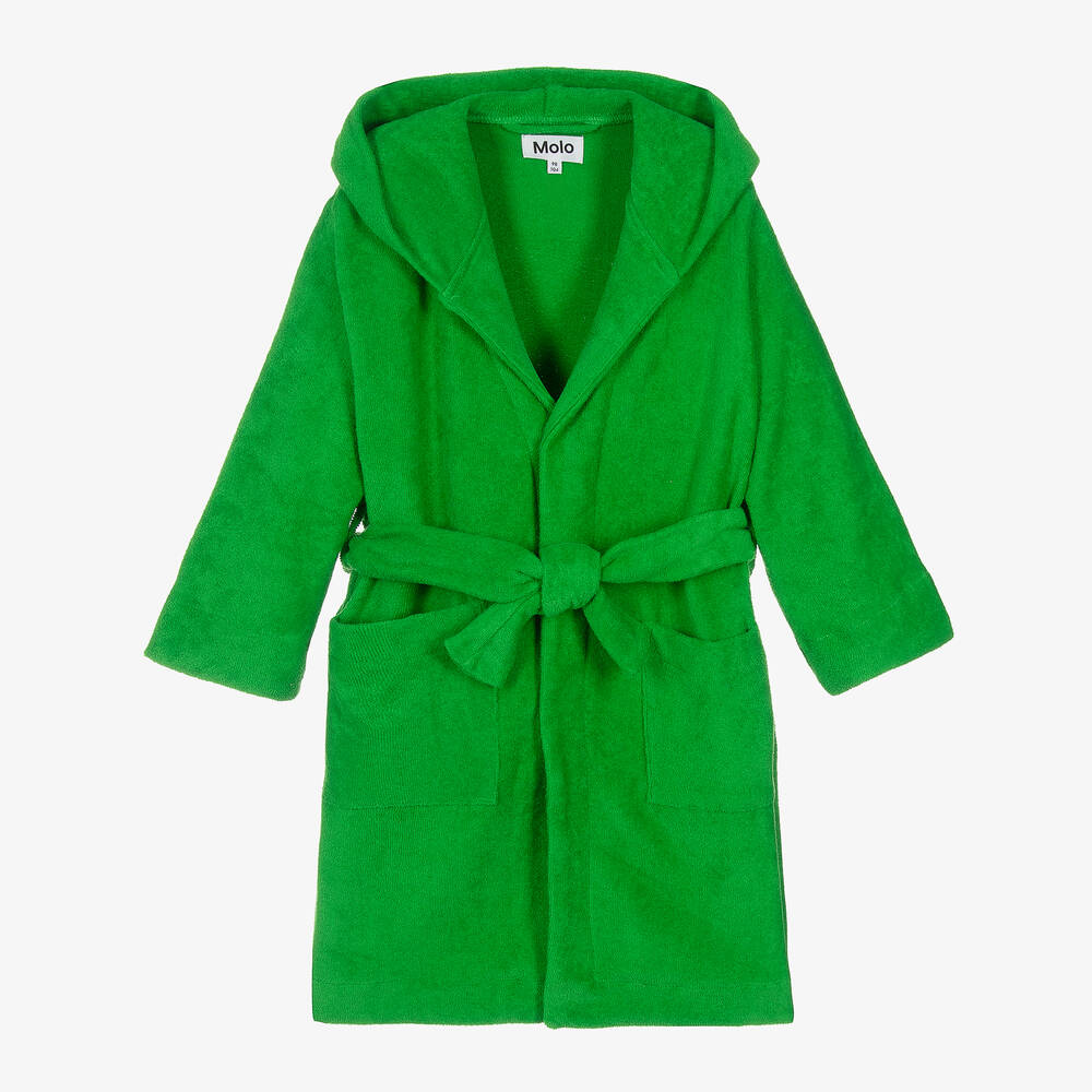 A vibrant green bathrobe for boys and girls by Danish brand Molo, made in soft terry towelling. Ideal for after a bath or swim, this cosy robe features two generous front pockets and a hood to keep the head warm. It is made in absorbent organic cotton and ties comfortably around the waist with a detachable sash belt.