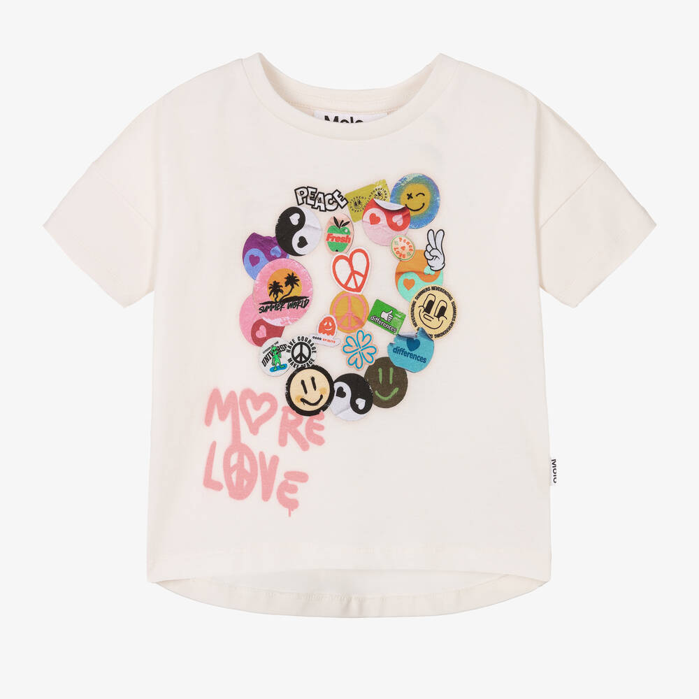 A short-sleeved T-shirt for girls by Danish brand Molo, in two differing shades of ivory. Made in stretchy organic cotton jersey, this casual top has a round neckline and a 70s-inspired sticker print on the front. The pink slogan reads 'More Love' and incorporates a peace symbol. The back hemline is slightly longer than the front.