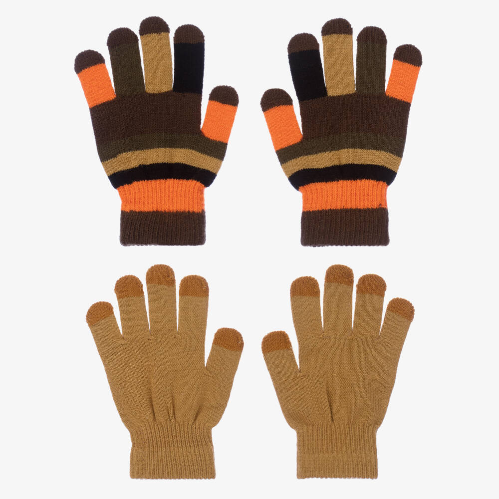Two pairs of knitted gloves for boys and girls from Danish brand Molo. One pair is in khaki yellow with tonal finger tip details and the other pair is in dark green, orange and khaki yellow stripes. Soft and comfortable, both have stretchy ribbed cuffs.