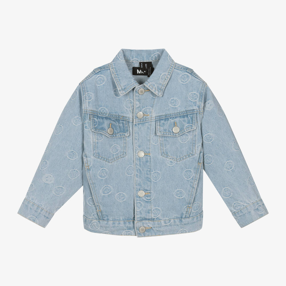 Effortlessly casual, this blue light wash jacket for boys and girls is made from cotton denim. Patterned with a subtle happy face design, it has a pointed collar and fastens with branded poppers down the centre. There are flap pockets on the chest, useful slanted pockets on the front, and the hemline is elasticated at the back for added comfort.