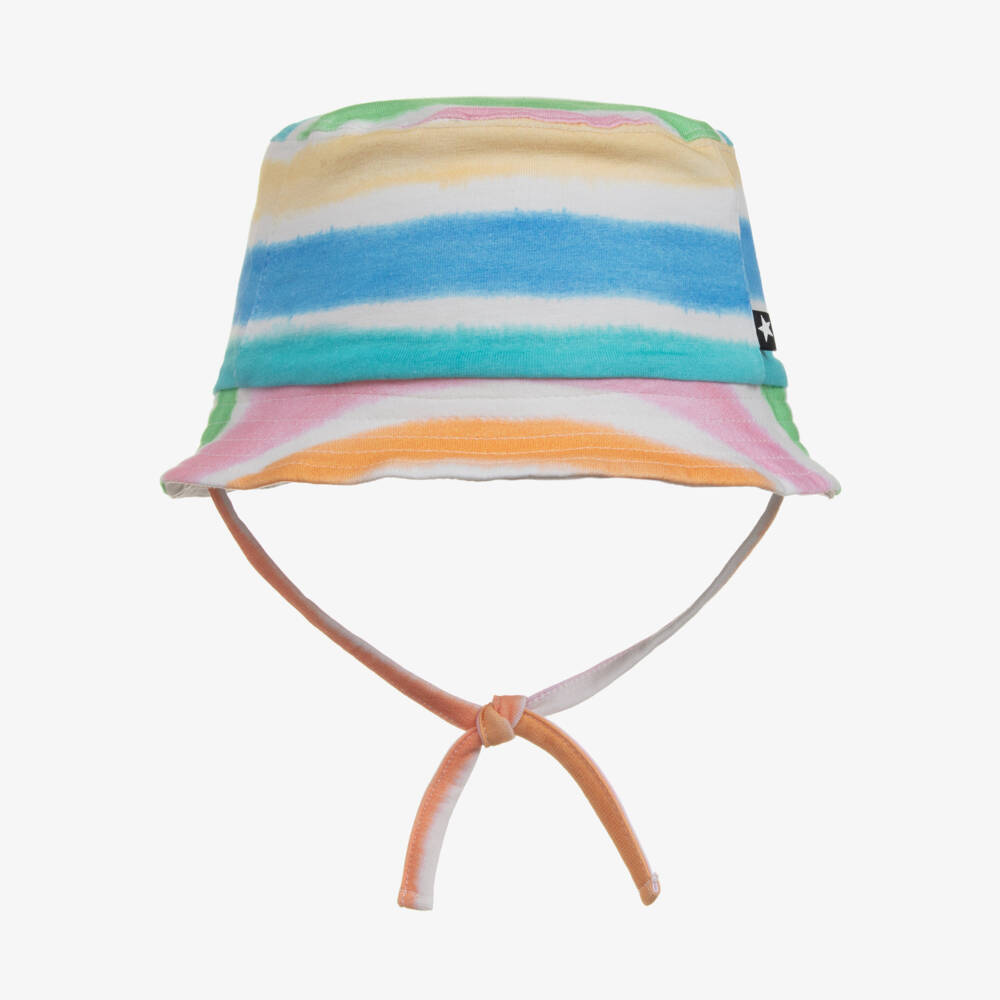A fun multicoloured sun hat for little boys and girls by Molo, made from soft organic cotton jersey. It has a bright and vibrant stripe pattern, with straps that fasten easily under the chin to keep it in place.
