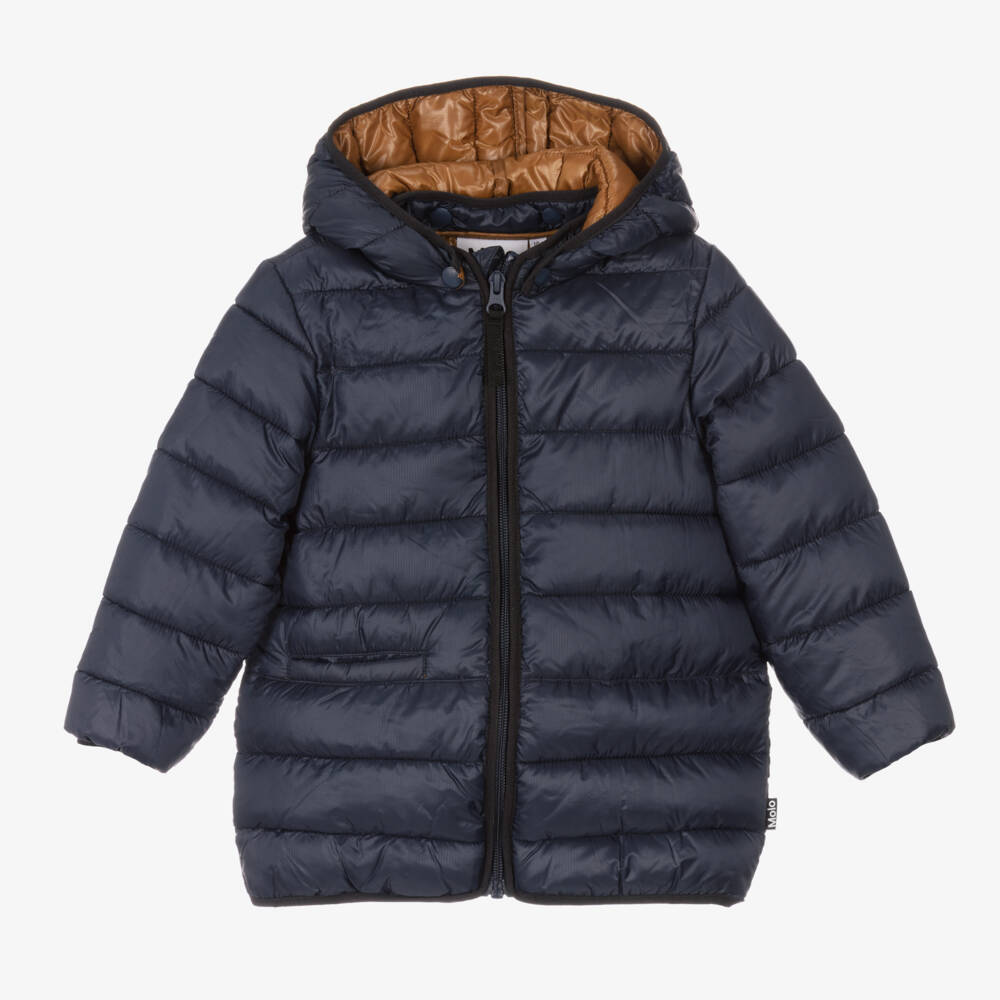 Navy blue puffer jacket for little boys and girls by Molo, with a silky brown lining. Made in smooth and silky fabric, it has an eco-friendly water-repellent finish and recycled polyester padding, with lightweight, super-soft and warm qualities. This jacket has a removable hood, dark blue trims and a useful front pocket.