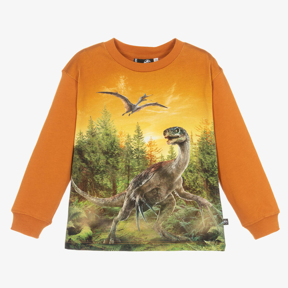 Burnt orange cotton top for boys and girls by Molo, with a print of two dinosaurs in a green forest. As part of the brand's Jurassic World collaboration, this casual top is made with super soft organic cotton jersey for a cool and comfortable fit.