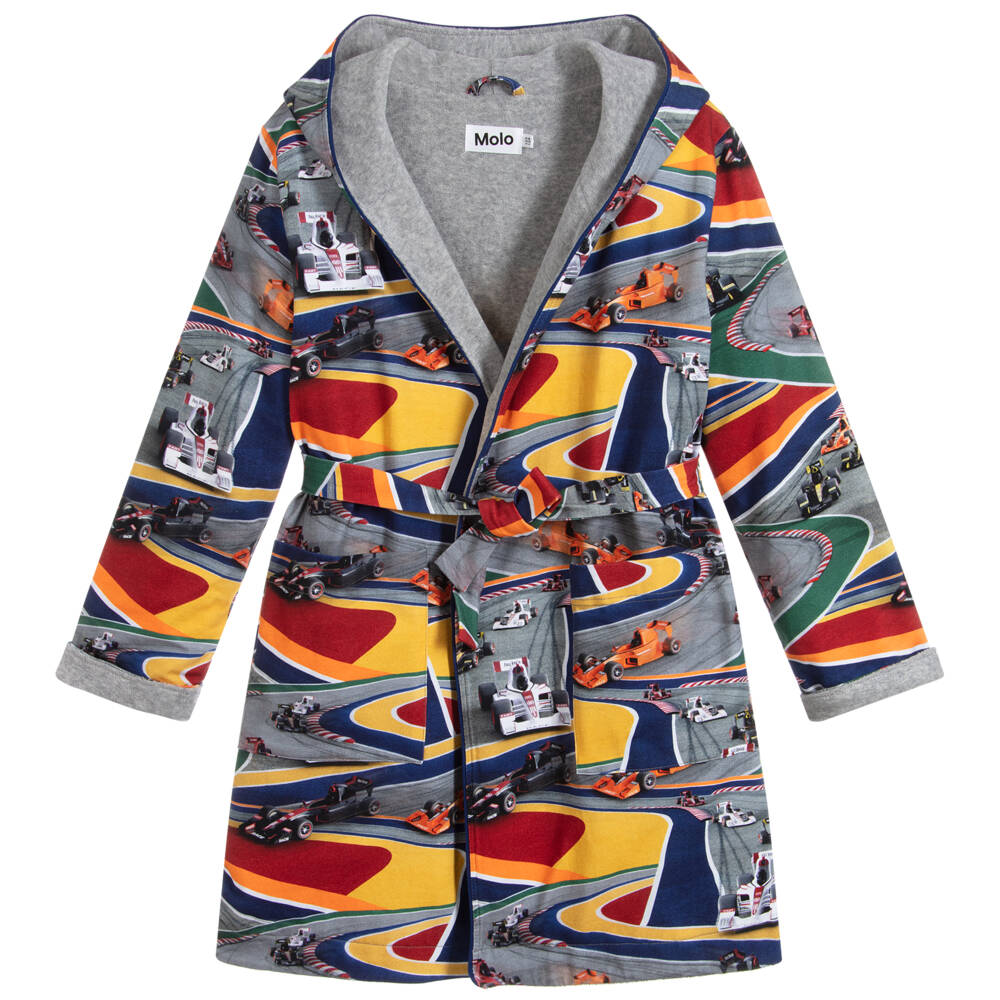 Boys grey bathrobe by Molo, with yellow and red racing car print. Made in soft and stretchy organic cotton jersey, it has a comfortable towelling lining, a hood and an elasticated waist with a tie belt.