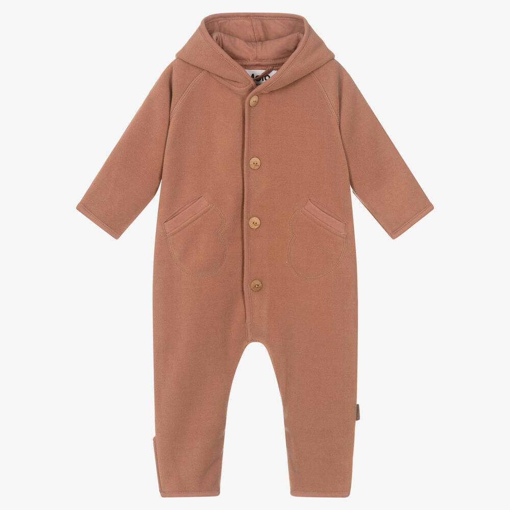 Dusky rose pink hooded pramsuit for baby girls from Danish brand Molo, made in super-soft polar fleece. Eco-conscious, this pramsuit is made with recycled polyester from plastic bottles. The sleeves and cuffs can be folded over for extra cosiness and protection from cold chills. It has piped trims, wooden button fastenings and cute mitten-shaped front pockets.