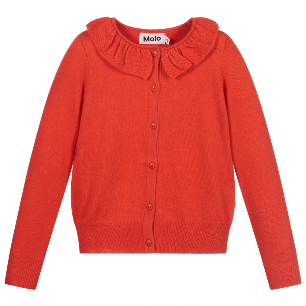 Girls tomato red knitted cardigan by Molo. Made in a soft, fine knit, with a ruffle collar and front button fastening.
