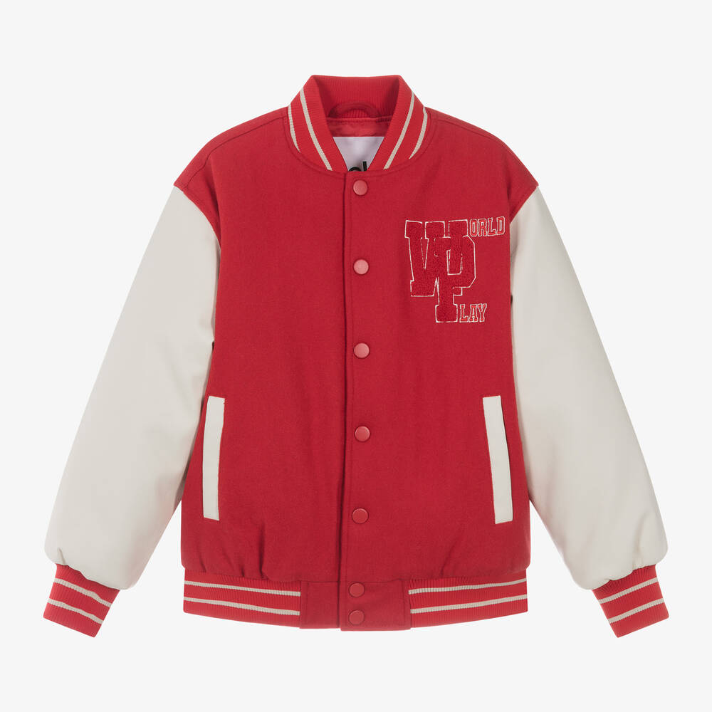 Red wool-blend varsity-style jacket for boys and girls by Danish brand Molo, with 'World Play' in bouclé and embroidered letters on the chest. Mid-weight, it is felted and padded for extra warmth, with striped, ribbed trims and a satin lining for comfort. It has useful front pockets and fastens with poppers.