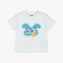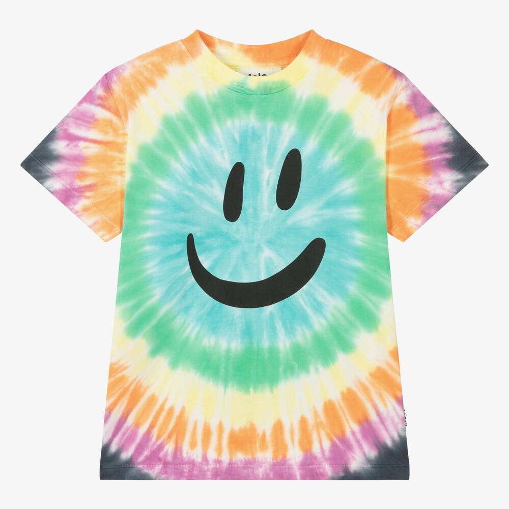 Multi-coloured, blue tie-dye T-shirt for teen boys and girls by Molo, inspired by stand-out rainbow shades. Instantly brightening any outfit, this fun, free-spirited design is printed with a happy, smiling face on the front. Made in soft organic cotton jersey, it is eco-friendly and super comfortable to wear on casual days.