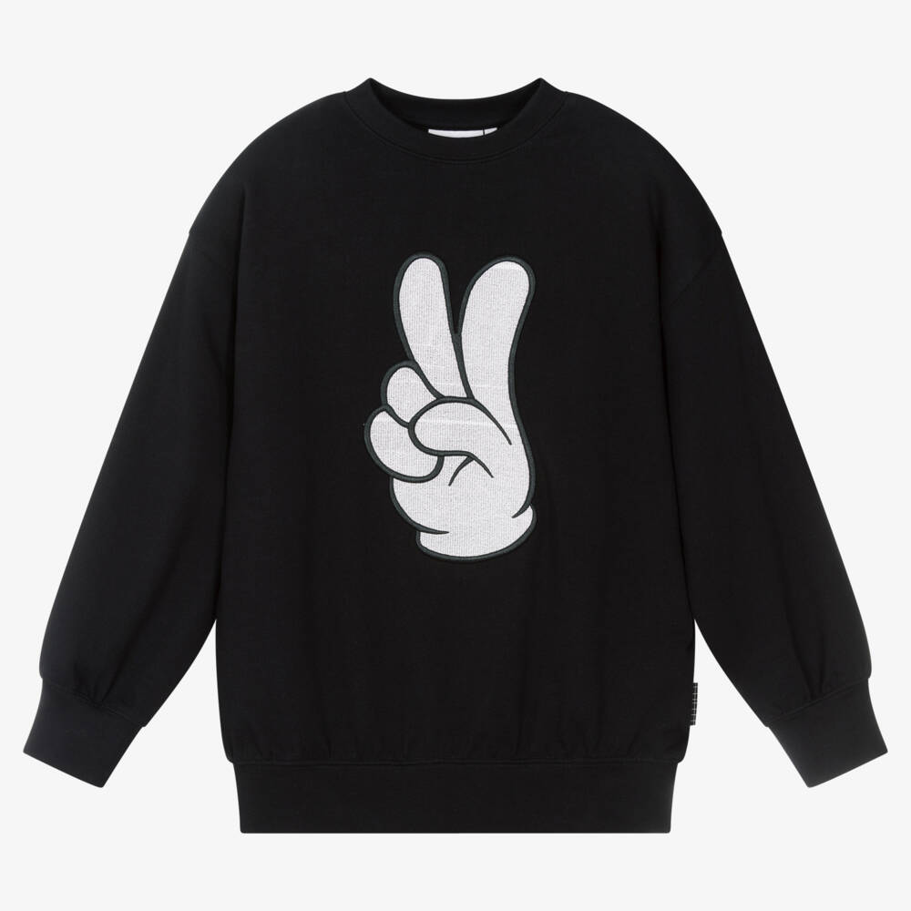 From Danish brand Molo, this black organic cotton sweatshirt is for teen boys. Ideal for layering during the transitional seasons, it has a large white embroidered cartoon hand on the front, making the peace symbol for a cool laid-back look.