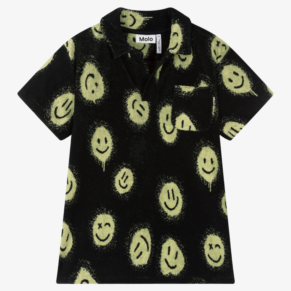 Casual black polo shirt for teen boys by Danish brand Molo, patterned with vibrant yellow happy faces. A comfortable, relaxed style, it is made in soft cotton terry towelling, with an open neck and split hem. For a subtle designer finish, the chest pocket has an embroidered logo tab stitched on the side.