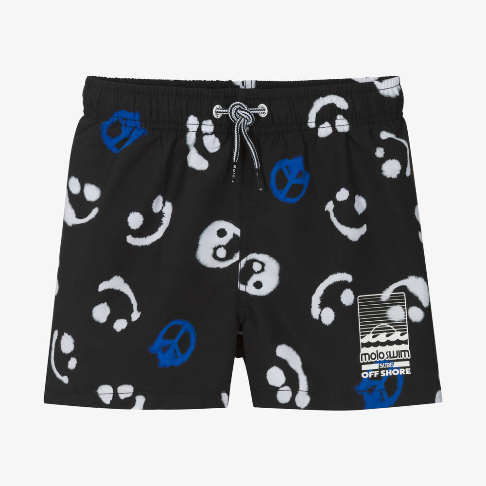 Cool black UPF 50+ swim shorts for teen boys from Molo. They have a spray-paint effect smiling face and peace sign print. The smooth fabric is made from recycled plastic bottles and they have a soft mesh lining. There is a logo print on one leg and an elasticated waist with drawstring ties for comfortable wear.