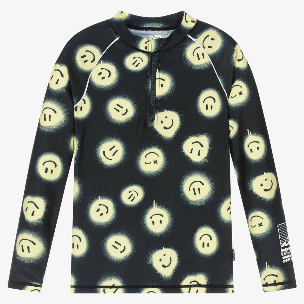 Black sun protective top for teen boys by Molo, with an all-over yellow happy face print. With a sun protective rating of UPF50+, this functional long sleeve, half-zip top is made using Repreve® fabric which uses recycled plastic bottles.