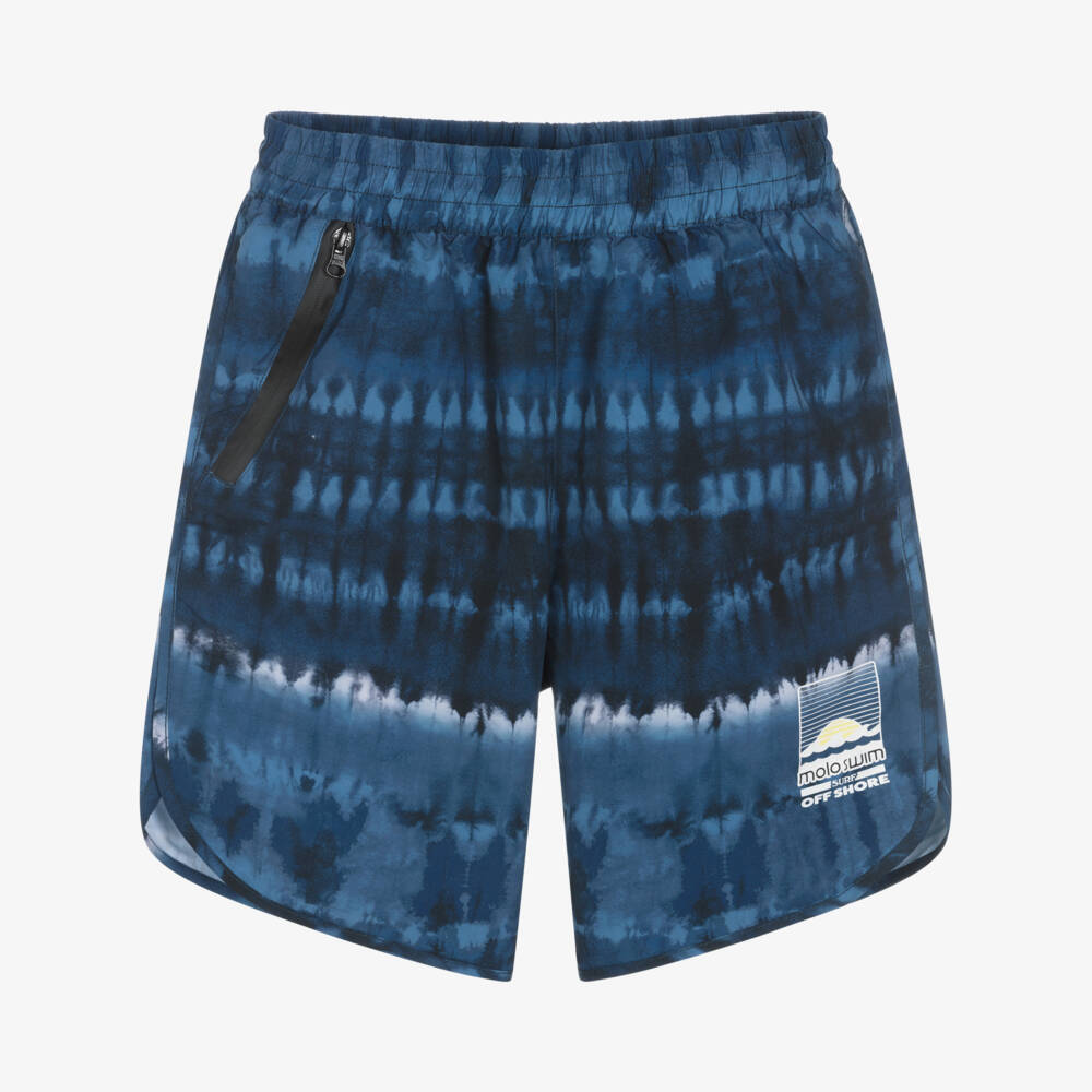 A pair of navy blue swim shorts for teen boys by Danish brand Molo, made from soft and lightweight recycled plastic bottles. Designed in a fun navy blue tie-dye print, they have a white surf-themed logo on the front and a black rubberised logo badge on the back. Ideal for swimming, they have an internal drawstring waistband and a comfortable mesh lining. They are finished with a single, zipped pocket on the front for carrying everyday essentials.