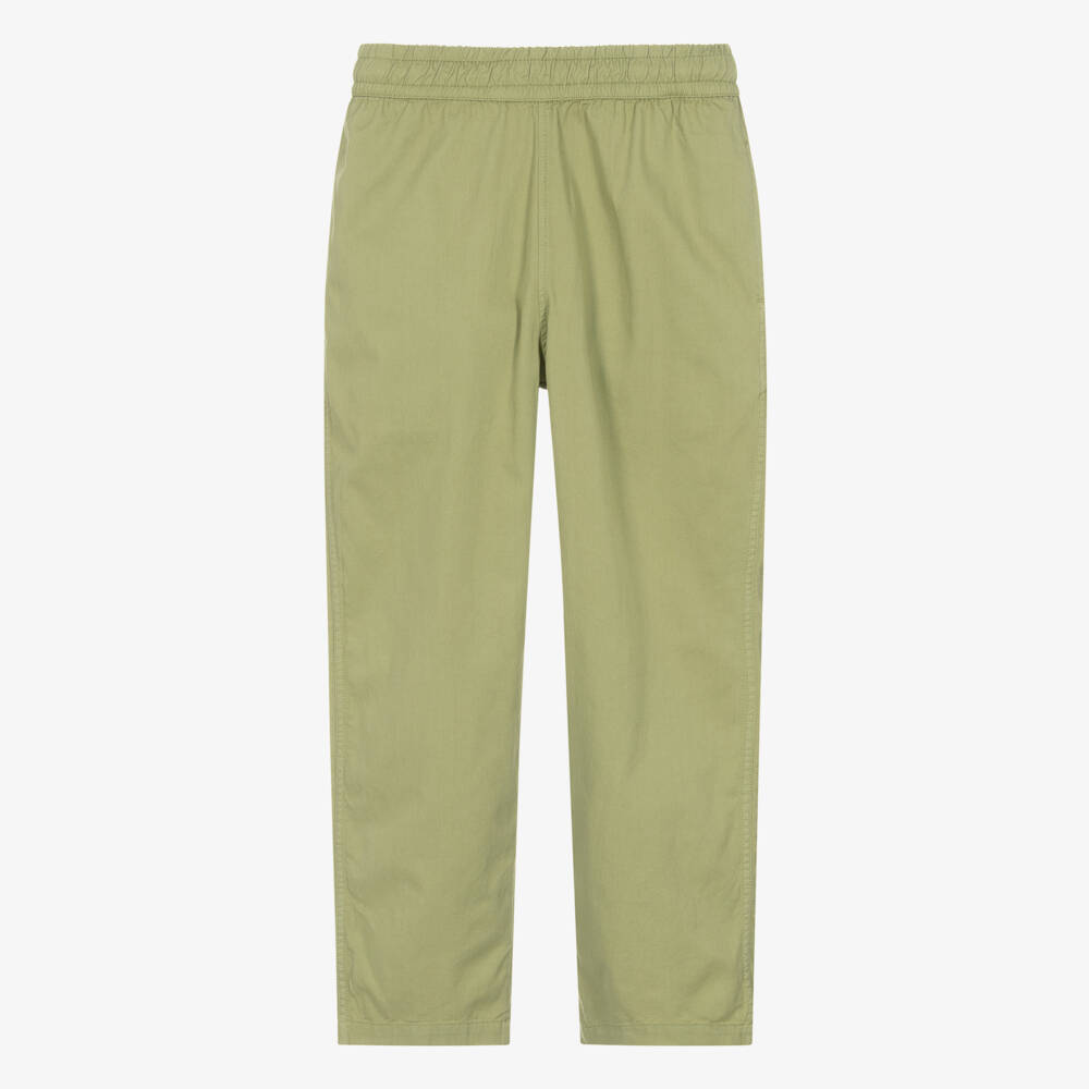 Relaxed fit, green trousers for teen boys by Danish brand Molo, made in soft organic cotton twill. Comfortable and casual, they have an elasticated waist with an internal drawstring tie for an adjustable fit. There are concealed pockets on the side seams and back, with a discreet logo tab to complete the look.