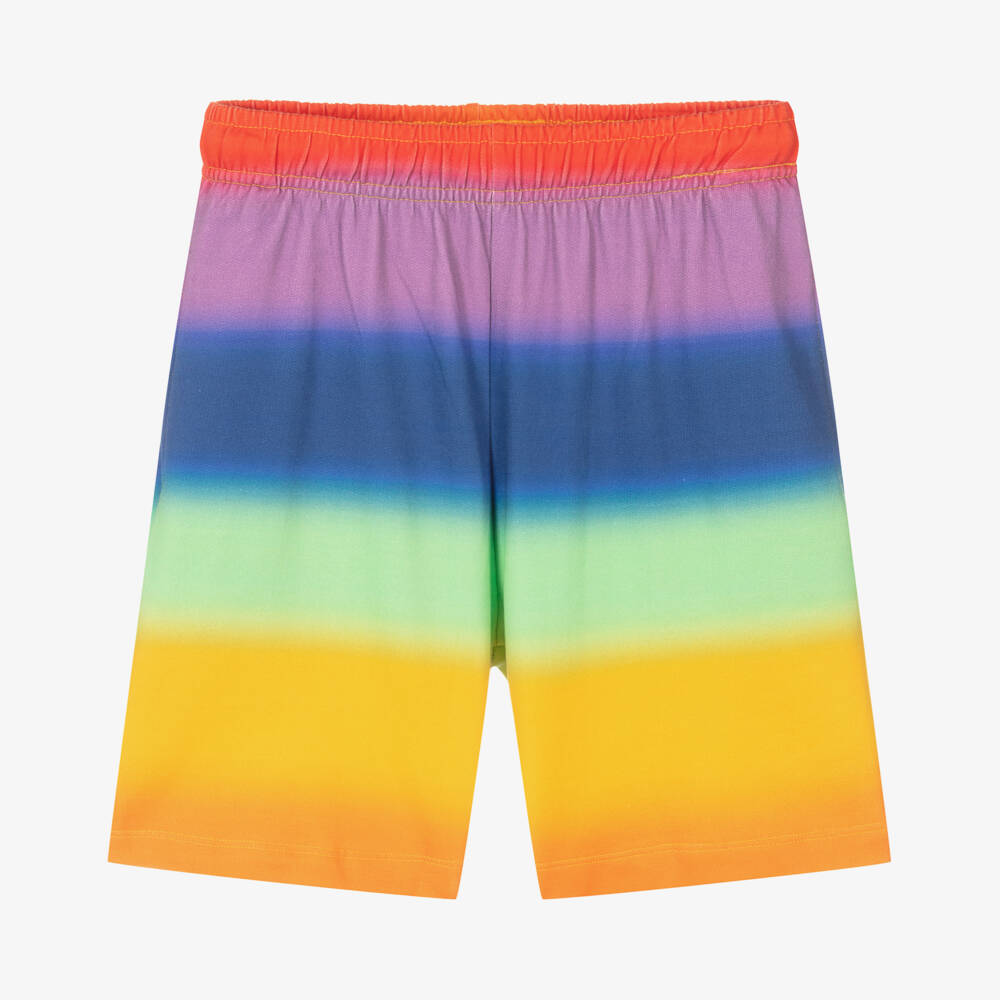 Fun and vibrant shorts for teen boys by Danish brand Molo, incorporating all of the colours of the rainbow. Celebrating the brand's twenty-year anniversary, they have 'Molo since 2003' printed on the back pocket, in addition to the monochrome logo tab. They are made in soft and comfortable organic cotton sweatshirt jersey with an elasticated waist with an internal drawstring and side seam pockets.