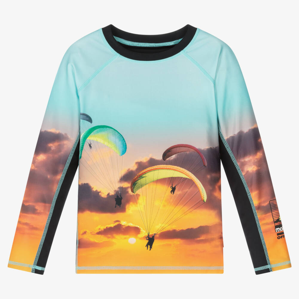 Turquoise blue and orange sun protective top for teen boys by Molo, with a fun parachute and cloud graphic print on the front. With a sun protective rating of UPF 50+, this functional long sleeve top is made with Repreve® fabric which uses recycled plastic bottles.
