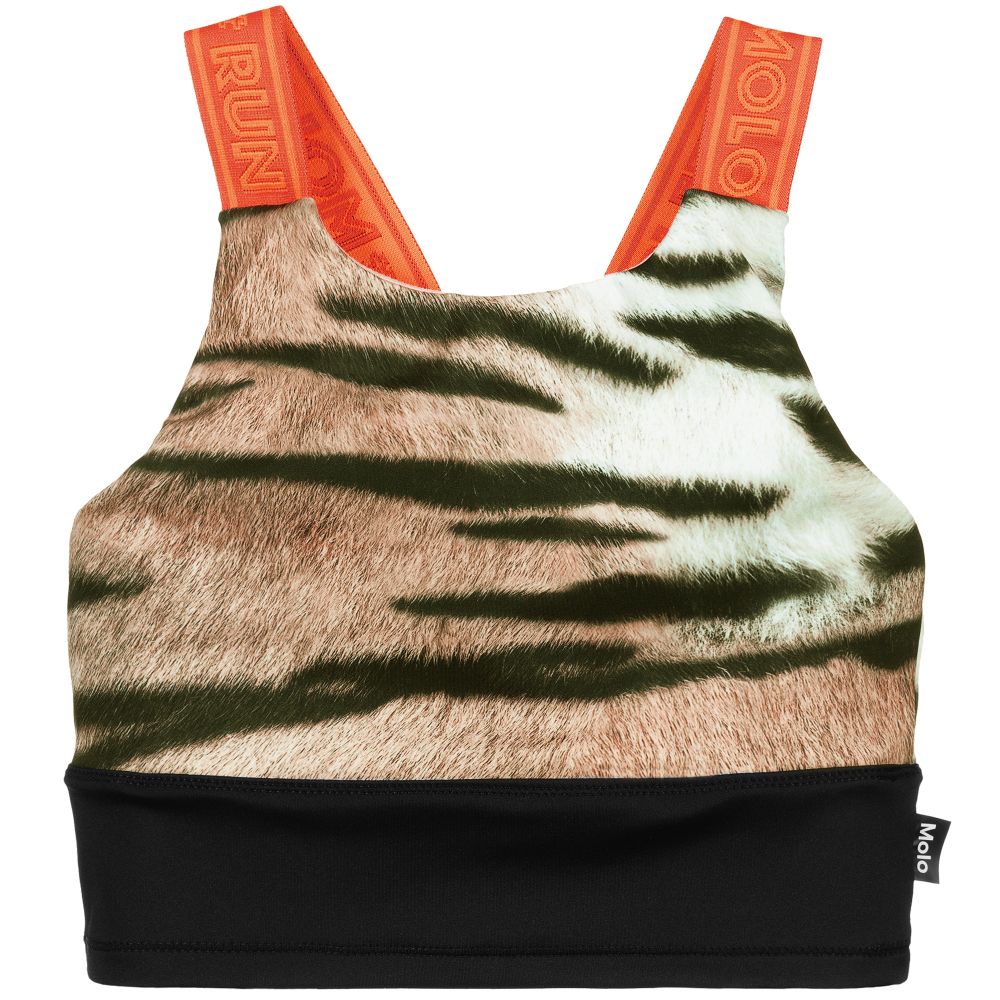 Teen girls activewear cropped top by Molo, with a brown, black and off-white Tiger print. Silky and stretchy, it has Heiq Smart Temp lining, which reacts with the body's temperature and sweat level, to keep the wearer cool and comfortable. The orange elasticated straps have logo text.