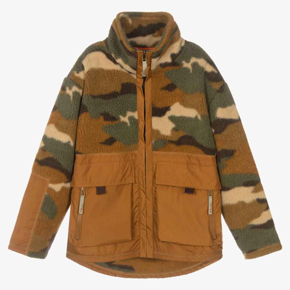 From Danish label Molo, camouflage print brown and green zip-up fleece top for teen boys and girls. This comfortable top has utility-style pockets on a silky mustard brown panel and is made from eco-conscious recycled polyester. Each zip fastening has a logo tab and there is a reflective slogan printed on one sleeve.
