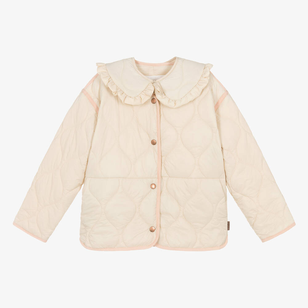 Pale beige with pink trims, this quilted jacket for teen girls is by Danish brand Molo. The silky smooth fabric is partly made from recycled material and uses Bionic Finish Eco technology for a water repellent finish. Lightly padded with technical down for warmth, it fastens with rose gold poppers and has useful front pockets. A brown logo tab can be seen on the side seam. For a pretty feminine touch, it comes with a detachable frilled collar, which ties at the front.