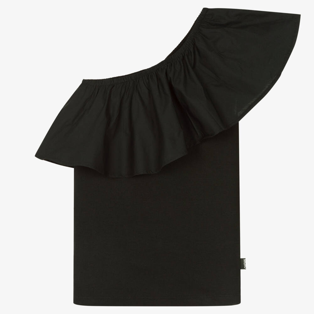 Stylish and comfortable for teen girls, this black asymmetric top is from Danish brand, Molo. Made in soft organic cotton ribbed jersey, it has a statement poplin ruffle around the neckline and over one shoulder.