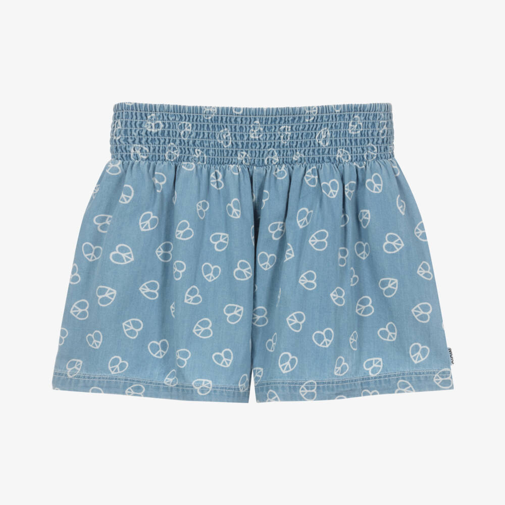 Casual and comfortable light blue chambray shorts for teen girls by Molo. Made in soft organic cotton, they have an all-over print of love peace hearts. There is a shirred waist for comfort and easy pull-on, with a branded tab on the side seam for a designer touch.