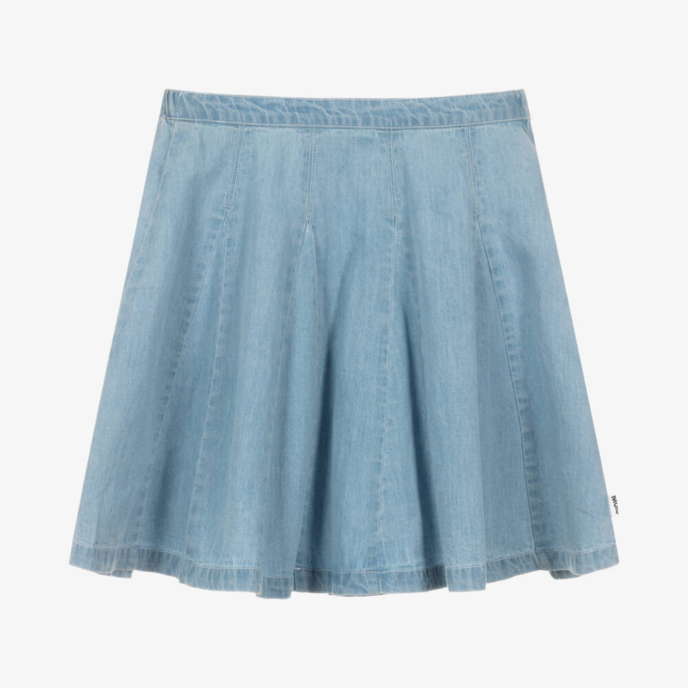A great addition to her casual wardrobe, this light blue panelled skirt for teen girls is by Molo. It is made in lightweight chambray, using soft organic cotton. It fastens easily with a zip on the side and is elasticated at the back for a comfortable fit. The branded tab on the side seam adds a finishing designer touch.
